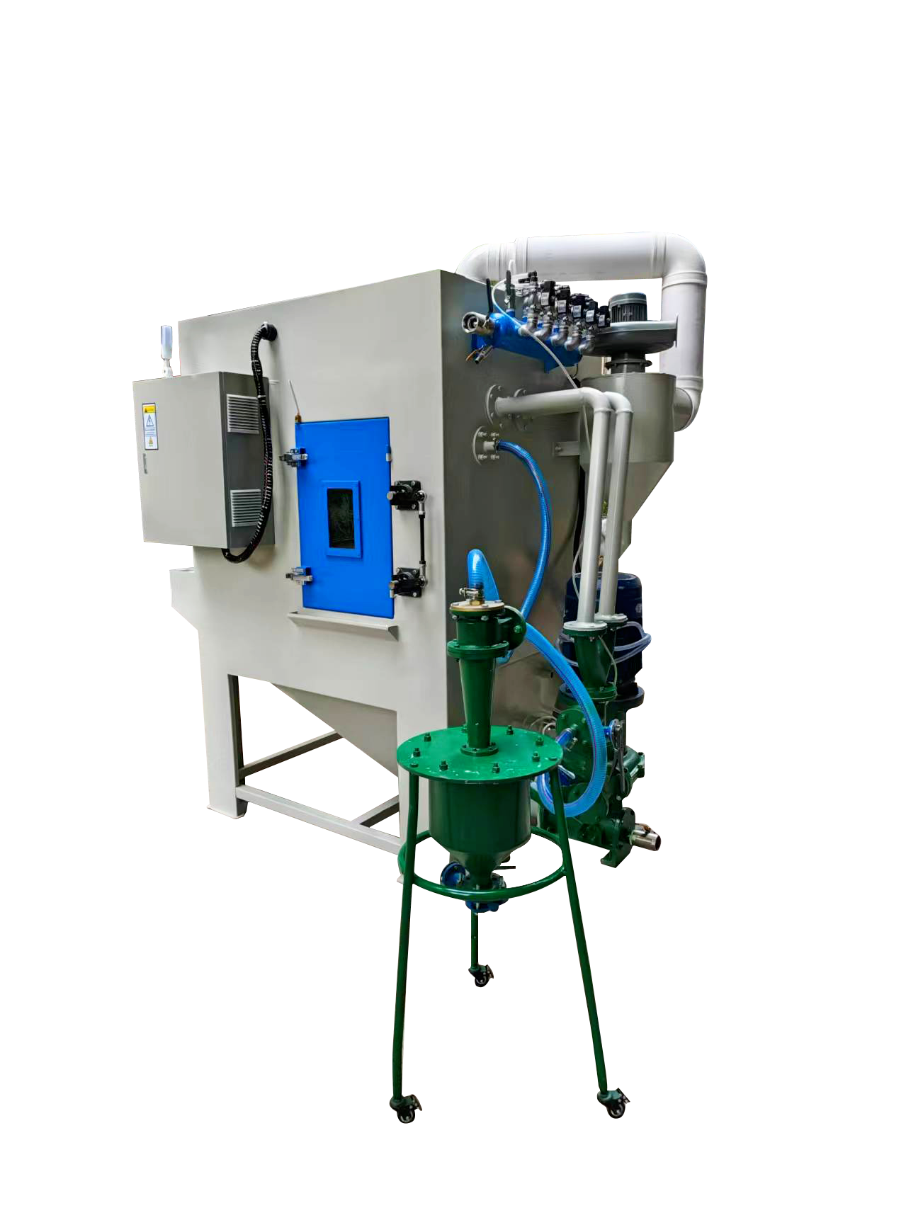 3, 配置專業(yè)的砂水泵,能高效混合磨料,噴砂后的產(chǎn)品手感更細膩、光澤度更好,和干式噴砂效果有明顯區(qū)別;